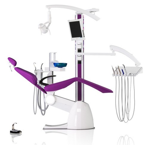 Цвет установки – белый. Боковые части блока врача и гидроблока декорированы хромированными накладками, несущая стойка имеет вставки в цвет обивки кресла.