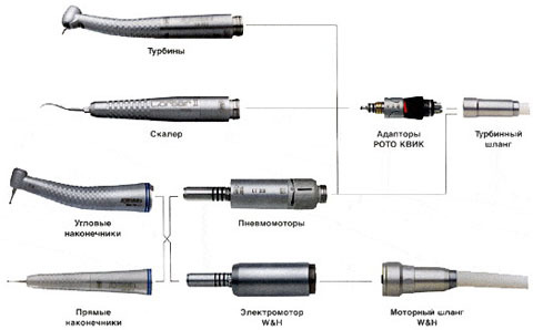 В наборе 2 кнопочных наконечника с керамическими подшипниками, пневмодвигатель, угловой и прямой наконечники.