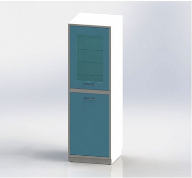 Шкаф одностворчатый на ножках, верхняя секция с УФ-бактерицидным облучателем, дверка изготовлена из металла с применением лазерной резки и стекла, 4 стеклянные полки. Нижняя секция с металлической дверцей и металлической полкой.