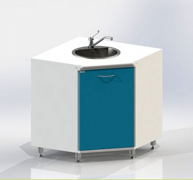 Тумба угловая с дверцей, с вырезом в задней стенке для подвода коммуникаций, оснащена мойкой из нержавеющей стали, локтевым смесителем, сифоном.