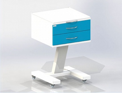 • Подкатная тумба - столик врача с двумя выдвижными ящиками, сверху стекло. Колесные опоры на резиновом ходу, две опоры с тормозным устройством.